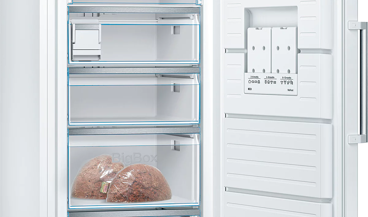 Bosch Serie 6 GSN58AWCV. Capacité net du congélateur: 366 L, Classe climatique: SN-T, Capacité de congélation: 22 kg/24h, Autonomie en cas de panne de courant: 26 h, Niveau sonore: 38 dB, Nombre d’étoiles (indique les possibilités de conservation): 4*, Système anti-gel. Emplacement charnière de porte: Droite. Type de lampe: LED. Classe d’efficacité énergétique: C, Consommation annuelle d’énergie: 178 kWh. Couleur du produit: Blanc