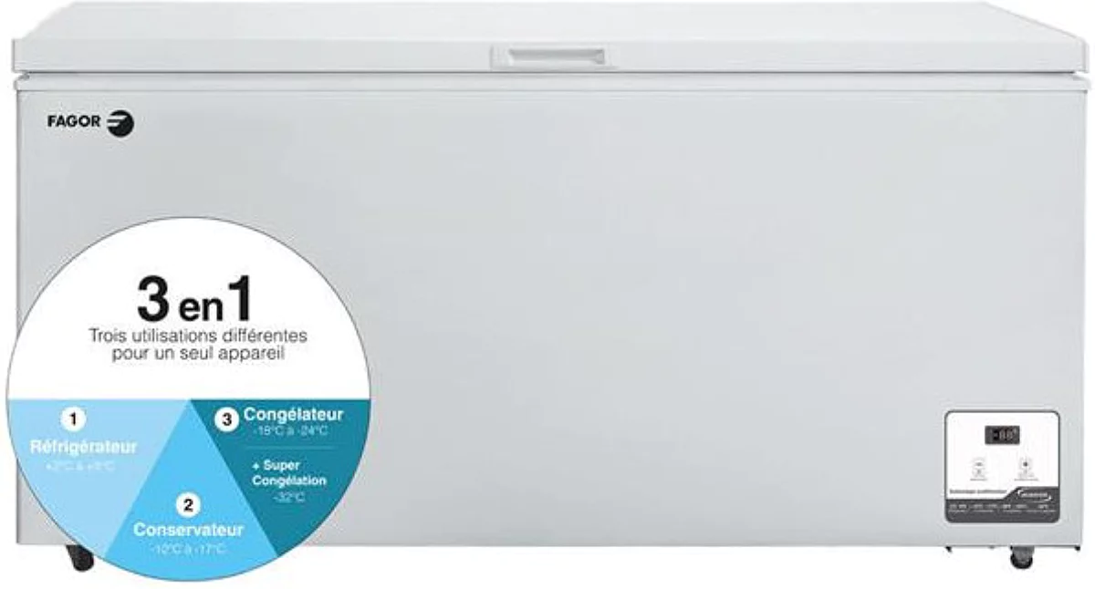 Congélateur coffre 500L – Multi-températures / hybride : 3 appareils en 1 (Réfrigérateur +2 à +8 °C / Conservateur -12 à -17°C / Congélateur -18 à -24° C + Super Congélation -32°C°